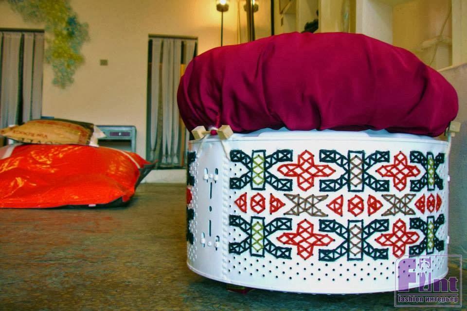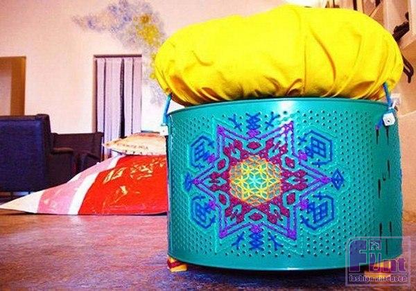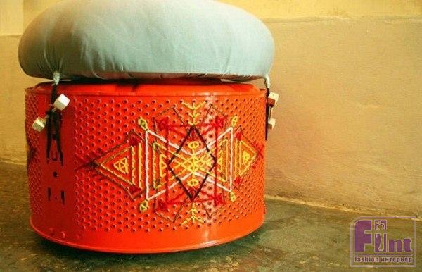Одна из последних разработок компании Junk Munkez представляет собой линию оригинальной яркой мебели с этническими мотивами. Называется Knit Knack. Веселые пуфики с этно-вышивкой и разноцветными подушками-сидениями когда-то были барабанами от старых стиральных машин.