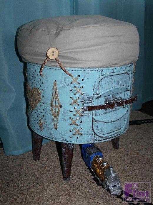Примечательно, что сделать такой креативный пуфик можно без труда своими руками! Для вдохновения можно использовать представленные на фото образцы, или сделать «вышивку» по дырочкам барабана и подушку на сиденье на свой вкус!