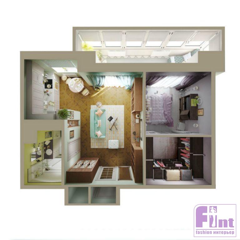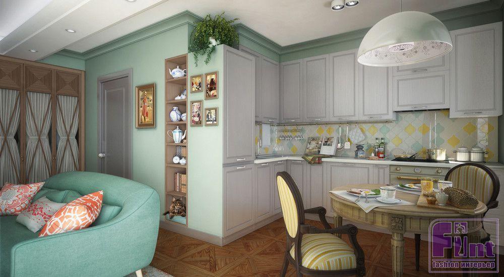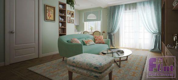 Цветовая гамма во всех комнатах разная и зависит от предназначения помещения. В спальне обволакивающий фиолетовый, в гостиной - зелено-голубые оттенки, на фоне которых контрастирует нежный оранжевый и желтый цвета, а в ванной серо-коричневую гамму разбавляет канареечный цвет. Заказчица призналась, что наконец-то она получила уютное гнездышко, где ей будет комфортно.