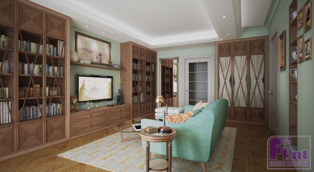 В гостиной предусмотрены любые места хранения, начиная от верхней одежды, заканчивая вместительной библиотекой. Из-за конструктивных особенностей дома (балок и нестандартного воздуховода) удалось сделать двухъярусный потолок с карнизным равномерным освещением и встроить нишу под коллекцию гжельской посуды, а также создать домик для хозяйского кота.