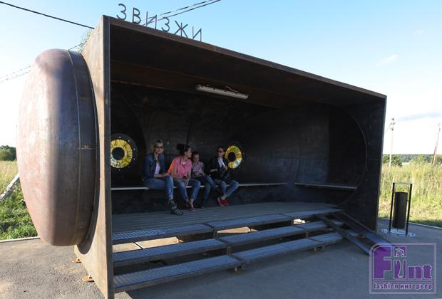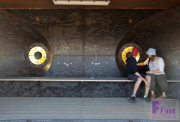 Последняя часть экспозиции — автобусная остановка, построенная из муковоза. Его всего лишь перевернули, покрасили, а внутри установили скамейки.
