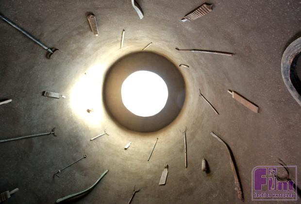 Внутри башни разместился небольшой музей: Чобан и Стерлигова собрали предметы деревенского быта и повесили на стенах. Здесь колеса, лопаты, коромысла, хомуты и уздечки для лошадей, корыта, пилы и другое. Подписей нет — назначение инструментов угадывается без труда.