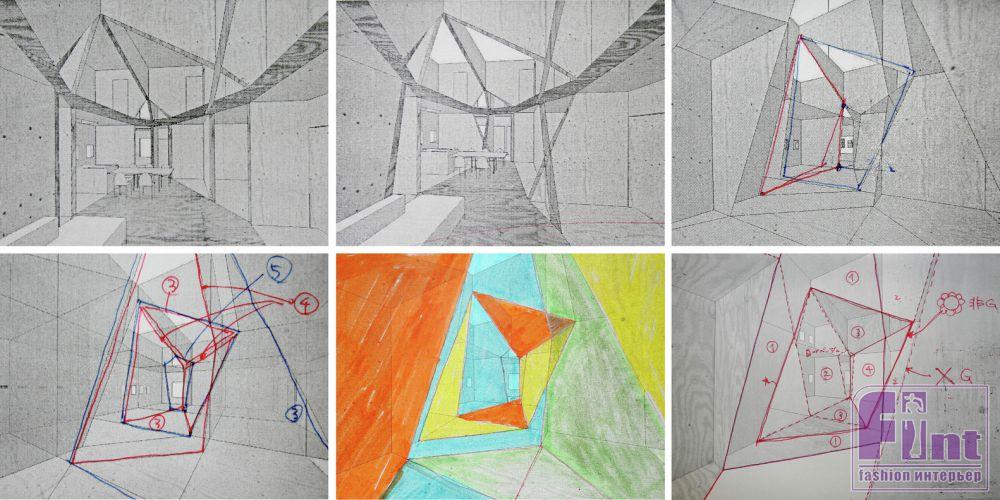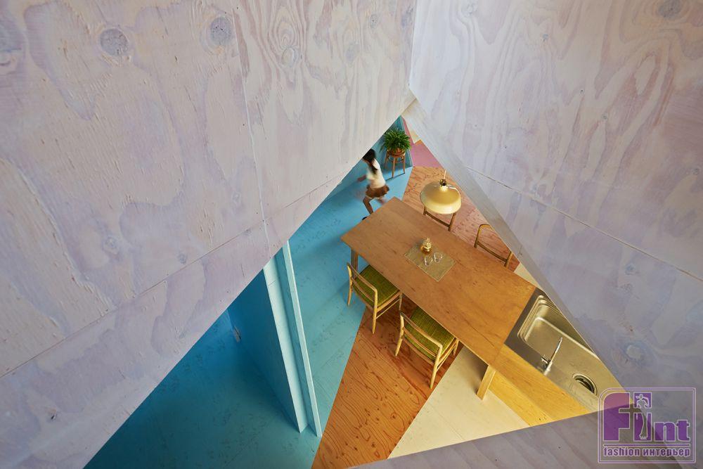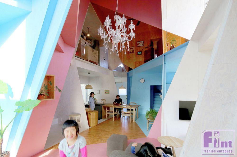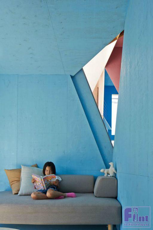 Смелые сочетания цветов создают также эффект углов там, где их нет. Для того, чтобы интерьер не стал слишком контрастным, были выбраны розовый, синий, желтый и голубой. Разумеется, обои в оформлении не использовались - им предпочли краску.