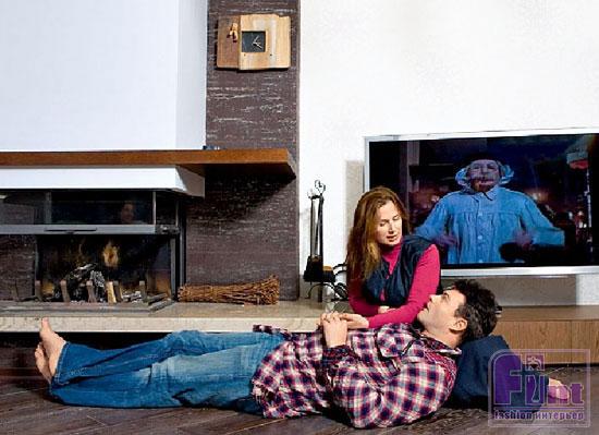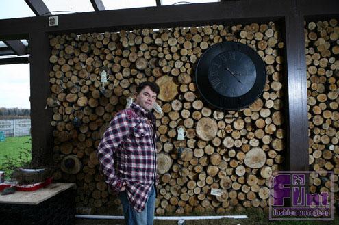 Интерьер дома четы Дятловых очень необычный. Чего стоит изогнутая лестница в центре просторного зала и стена из дров, на которой висят часы. Это полностью заслуга хозяев. Евгений рассказал, что как только дело дошло до внутренней отделки, у них начались разногласия с дизайнером. Специалист предлагал типовые решения, супруги же хотели что-то особенное.