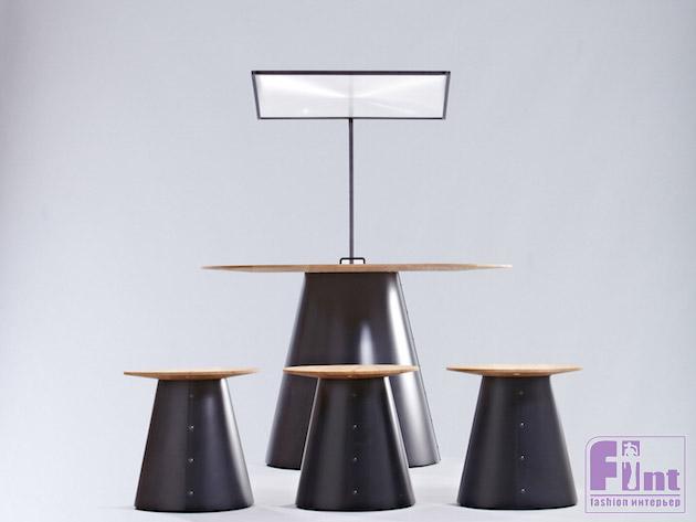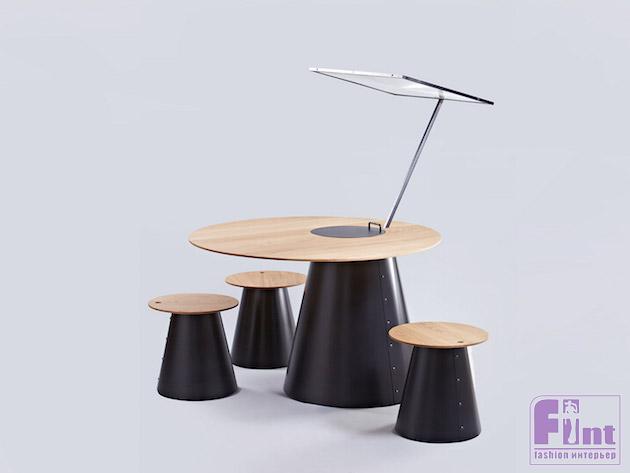 Материалы, которые использовались в дизайне этой необычной мебели с говорящим названием «SUNPlace» – древесина дуба и сталь. Благодаря такому выбору дизайнеров удалось еще раз подчеркнуть экологичность всей задумки. Стол и табуреты для барбекюшницы выполнены в едином стилистическом ключе и вполне гармонируют друг с другом.