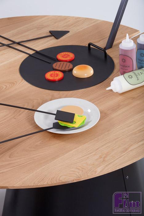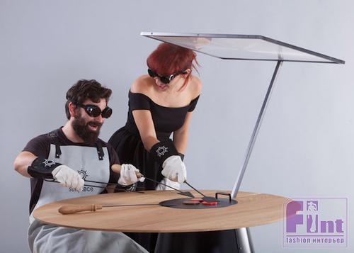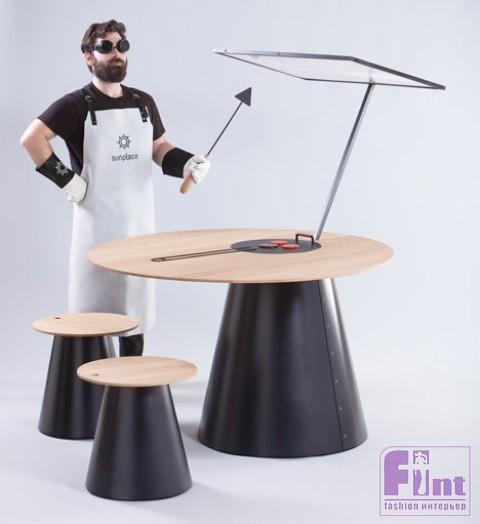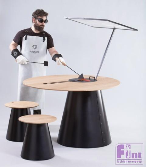 Комплект для барбекю состоит из нескольких табуретов радиальной формы и круглого стола, сверху которого установлена большая линза, фокусирующая солнечный свет в центре стола. Благодаря тому, что сконцентрированный поток солнечных лучей способен разогревать поверхность до огромных температур, становится возможным даже приготовление пищи. Конечно, люди придумали множество других способов готовить еду на природных и экологичных источниках энергии без сжигания топлива, например, закапывание яиц в горячий песок, но этот способ выглядит особенно оригинальным.
