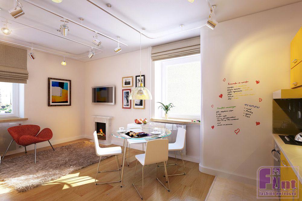 В гостиной зоне удалось разместить биокамин, над которым установлен телевизор на поворачивающемся кронштейне. Это очень удобно: ТВ можно смотреть, сидя на кровати или в кресле, а также за обеденным столом. Справа от кухни расположен вентиляционный короб, обыгранный с помощью специальной краски: на ней можно рисовать, как на маркерной доске. Например, записать список покупок, рецепт понравившегося блюда или просто порисовать.