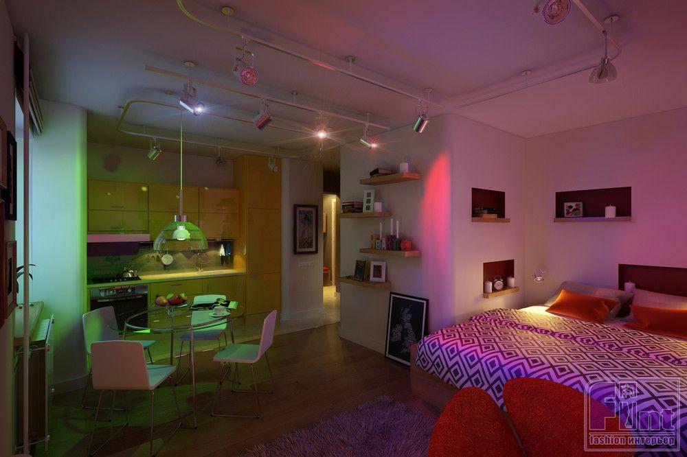 Квартира в современном стиле предназначена для молодой пары из Санкт-Петербурга, предпочитающей яркие жизнерадостные цвета. При этом интерьер был досконально продуман не только с эстетической, но и с функциональной стороны, в результате чего студию удалось сделать эргономичной и очень уютной. Стены, окрашенные в белый цвет, визуально увеличивают пространство, а яркие элементы и разноцветная подсветка делают интерьер живым и динамичным.