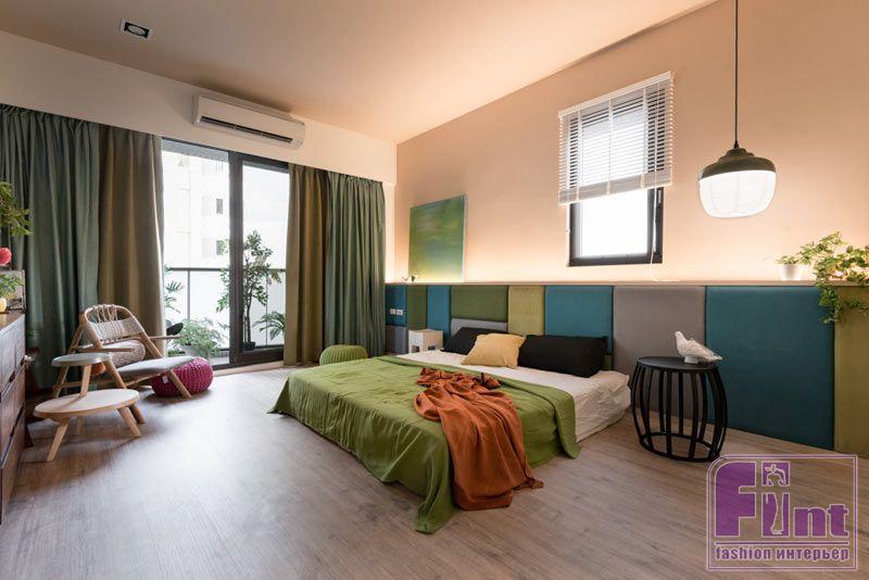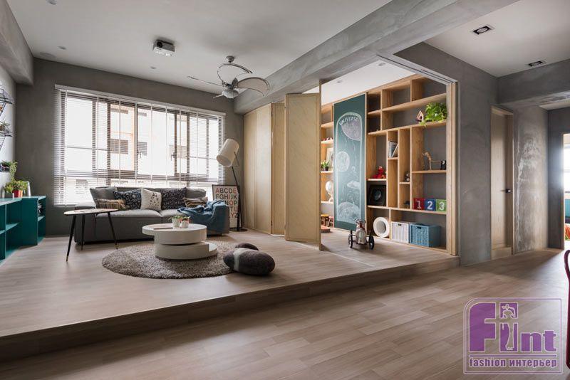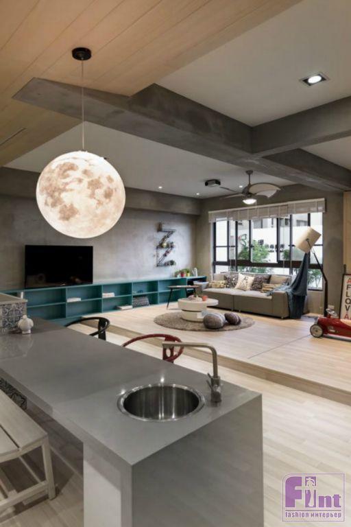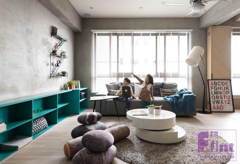 Молодая семья из города Гаосюн на Тайване, опасаясь, что активная жизненная позиция их собственных детей нанесёт непоправимый ущерб новой квартире, долго искала дизайнеров, которые смогли бы сделать её устойчивой к любым катаклизмам. Наконец, нужные люди нашлись. Дизайнеры мастерской HAO Interior Design сразу решили отдать главную роль в интерьере бетону. Бетонные стены при этом стали фоном, выгодно оттеняющим яркие цветовые акценты квартиры. Так, в зоне гостиной вдоль стены установлен невысокий стеллаж бирюзового цвета, монохромность кухни разбавляется красным цветом стульев, а спальня «раскрашена» зелёным и оранжевым текстилём.