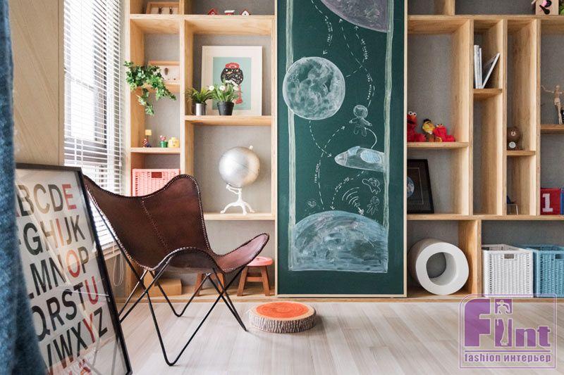 Стилевой центр квартиры - детская комната. Протяжённая по форме, она прилегает к гостиной и кухне и закрывается плотными деревянными дверями, хорошо вписывающимися в стилистику как детского, так и «взрослых» помещений. При этом уровень пола комнаты несколько выше уровня, на котором расположена гостиная. Таким образом достигается эффект дополнительного зонирования пространства даже тогда, когда двери открыты.