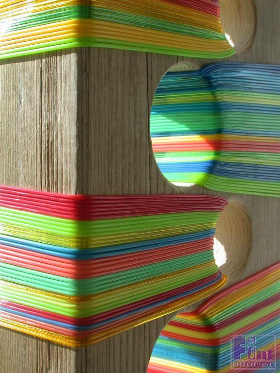 Разноцветные полоски ткани, шнурки, нитки, веревки - теперь это любимый инструмент художницы. Главное, чтобы это было цветным и ярким. Так, из кусков дерева и обломков веток она может смастерить креативные ожерелья или кулоны, а ненужные доски, бревна и прочие остатки древесины в сочетании все с теми же яркими нитками и веревками станут превосходным украшениям для будничных улиц, а также маленьких двориков и приусадебных территорий и, конечно же, стильных и модных интерьеров.
