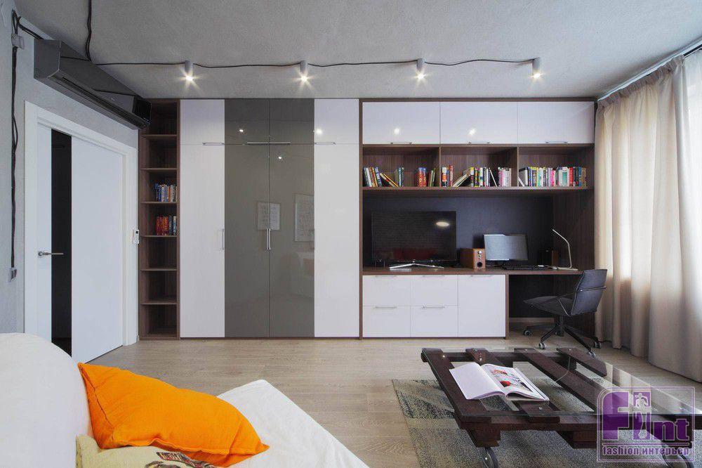Оттенок фасада точно подобран к цвету стен, а сложные внутренние ящики устроены именно так, как удобно заказчику. Оживляют помещение гостиной текстиль (оранжевый диван, подушки с ярким принтом), а также разнообразные источники освещения.