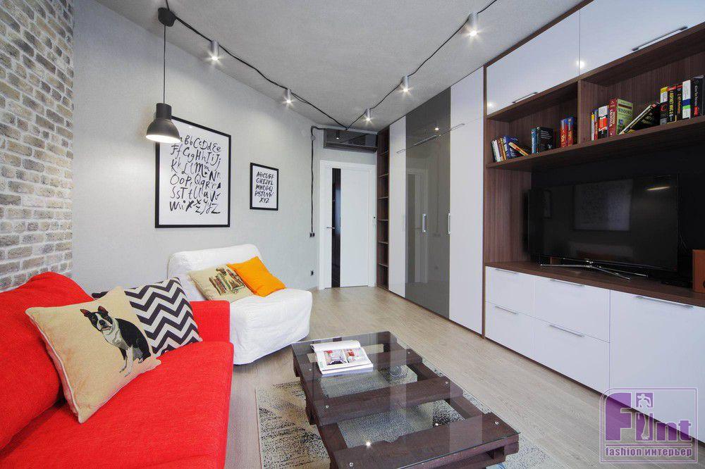 Бетон в проекте смотрится лаконично и брутально. Стены и потолок выполнены в одном цвете, что видоизменяет геометрию помещений. Стена из декоративного кирпича в гостиной делает все остальные ограждающие конструкции второстепенным. Вместительный шкаф напротив дивана спроектирован с учетом выступов стен, благодаря чему он зрительно выравнивает и увеличивает пространство.
