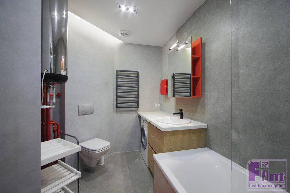 Открытая проводка, позволившая сэкономить дефицитное пространство, - далеко не единственный элемент стиля лофт, взятый на вооружение дизайнером Натальей Главатских. Не менее важны здесь и «взрывные» акценты. В этом проекте у них двойная функция - зонирование, с одной стороны, и отвлечение внимания от сложной геометрии - с другой. Так эффектные трубы ванной, покрашенные в красный цвет, и нарочито выделенный водонагревательный бак выполняют не только утилитарную функцию, но и эстетическую.