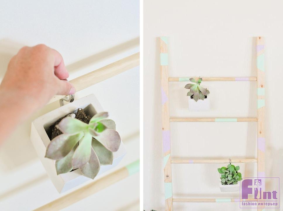 Такую декоративную лестницу можно использовать для хранения и сушки полотенец, а можно на перекладины повесить горшки с цветами. Простейшие подвесные горшки можно изготовить своими руками, просверлив в обычных керамических горшках по отверстию и вставив в них S-образные стальные крюки. В нашем случае горшки висят неровно, поэтому лучше всего они подойдут для выращивания суккулентов.