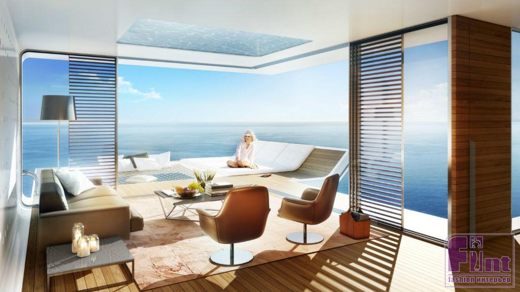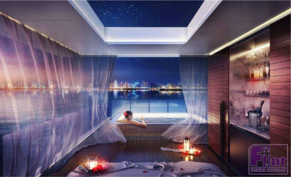 Площадь каждой постройки составит 518 кв. м. Два этажа плавучего здания будут располагаться над водой, и один сделают подводным. На втором, центральном, предусмотрены солярий, гостиная, кухня и столовая, а на самом верхнем этаже запроектированы еще один солярий, джакузи и минибар. Спальня и ванная разместятся под водой, в специальном модуле с панорамным остеклением.