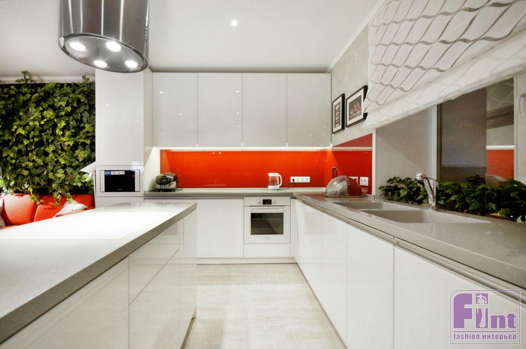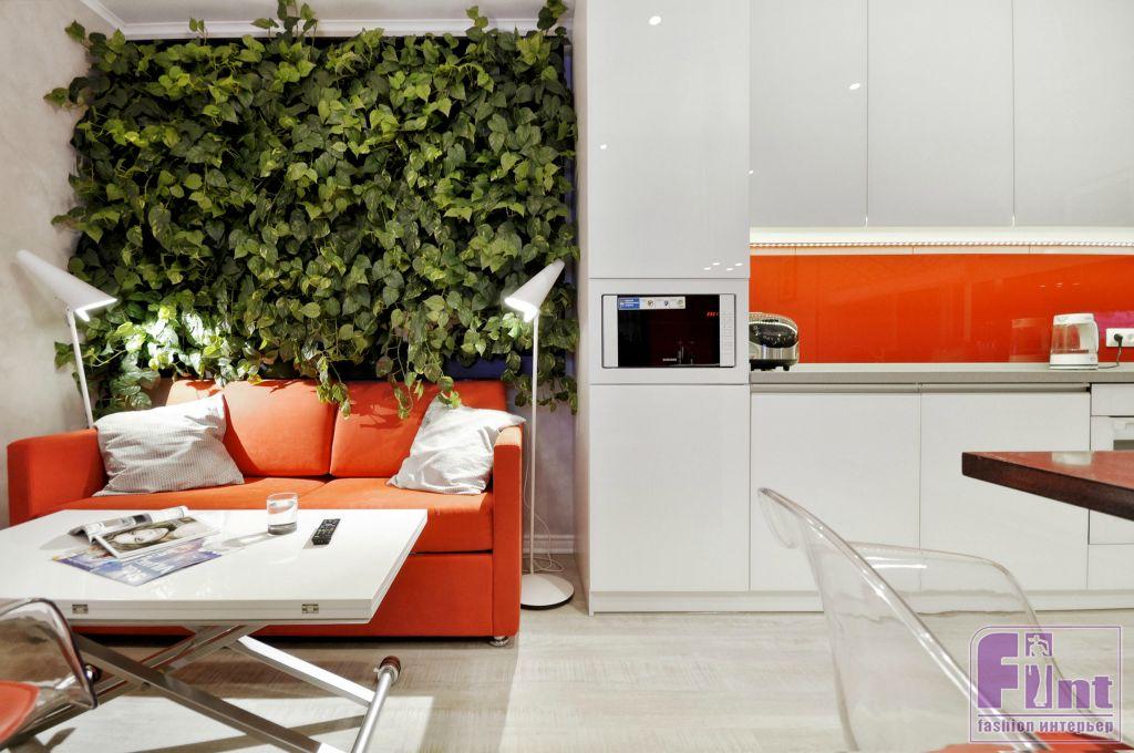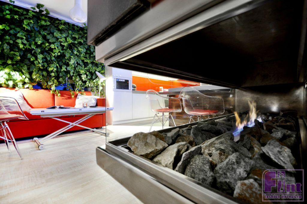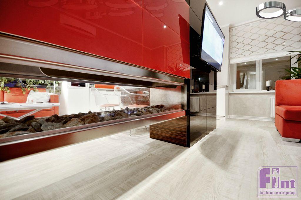 Молодая хозяйка квартиры очень любит проводить вечера с большими компаниями, и это необходимо было учитывать. Так же хозяйка хотела видеть в своём интерьере биокамин, телевизор с большим экраном и просторную кухню. Решение пришло сразу – помещение решили не делить, а сделать эффектный фальш объём и частично подвесить крупные элементы «в воздухе». Весь функционал, по замыслу дизайнеров, расположился в зале. Высокий контраст поддержан динамикой центральной конструкции, которая объединяет в себе сразу несколько задач. Главным акцентом выступил центральный подвесной камин с рабочим островом, холодильником и двумя телевизорами. Благодаря такому решению, удалось сохранить максимум пространства и сохранить свободу перемещения.