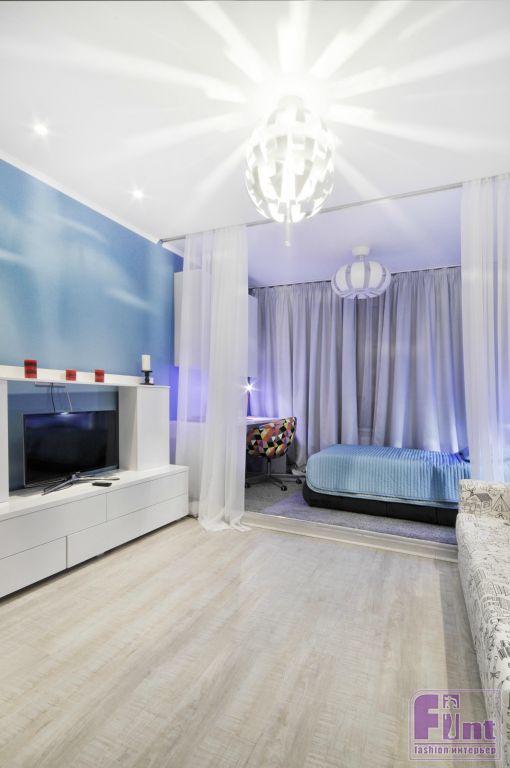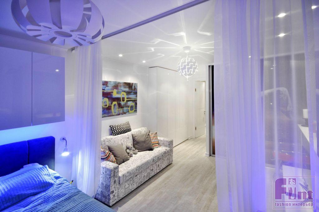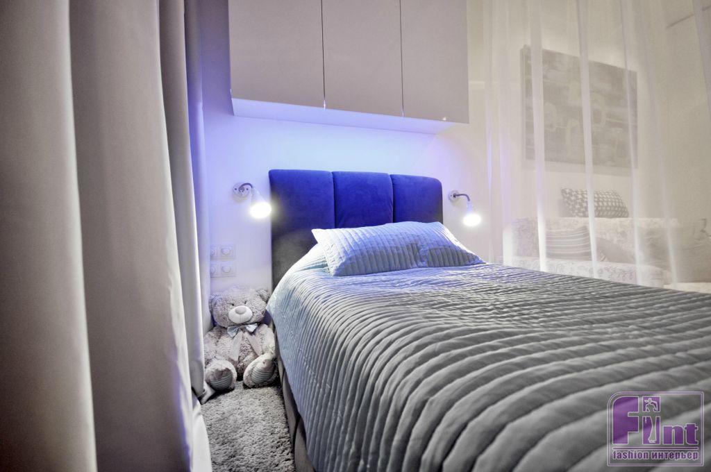 Комната для дочки хозяйка выглядит стильно и современно. В комнате присутствует только один цвет стены – сложный синий, остальные стены и потолок – белые. Саму комнату поделили на три части - это гардеробная, зона отдыха, и спально-рабочее место, которое выделили небольшим подиумом с подсветкой и разграничили лёгким текстилем, чтобы атмосферу спальни можно было легко трансформировать. Фасад встроенного гардероба декорирован фотопечатью.