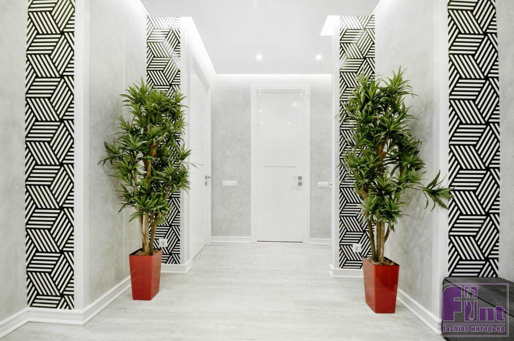 Холл в проекте REDJEU было решено сделать максимально светлым. Чтобы расставить акценты, в холл добавили контрастный орнамент и сделанные на заказ светодиодные акриловые светильники, которые вмонтировали в стены и углы.