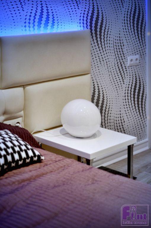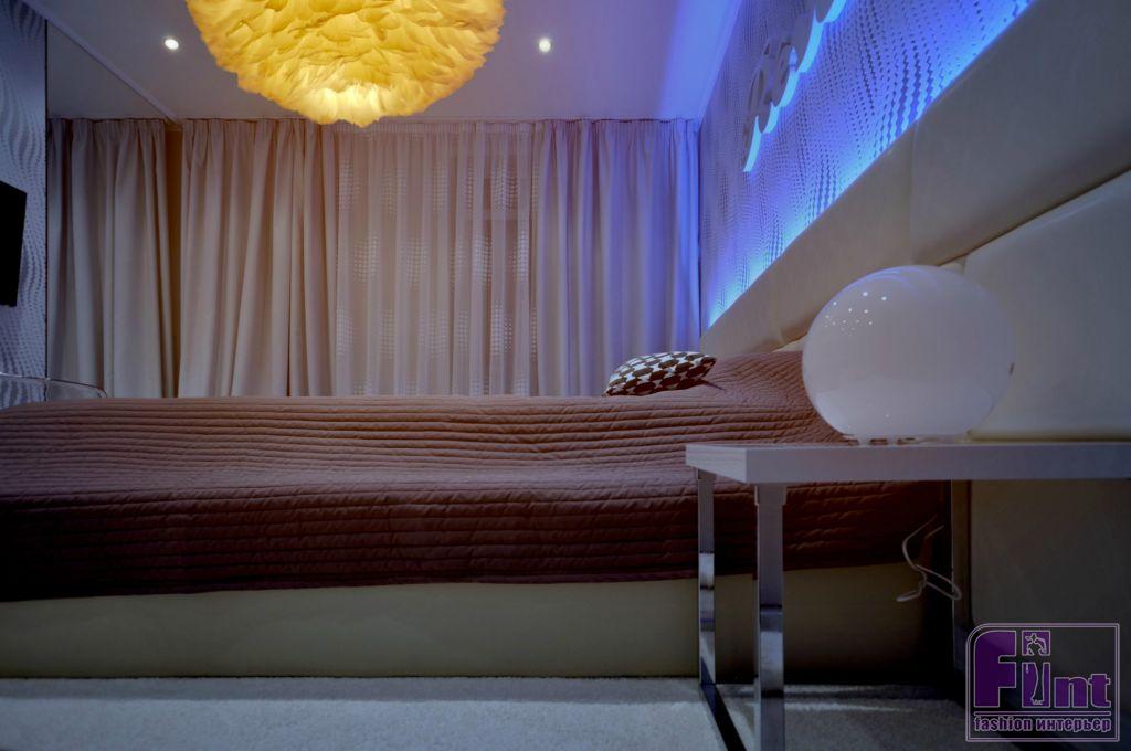 Спальная комната решена в светлых тонах. Там же удалось разместить просторную гардеробную. Объёмные 3D панели на стенах, большая кровать, в которую вмонтировали управление освещением, полами и подсветка в изголовье, чтобы подчеркнуть объём на панелях.