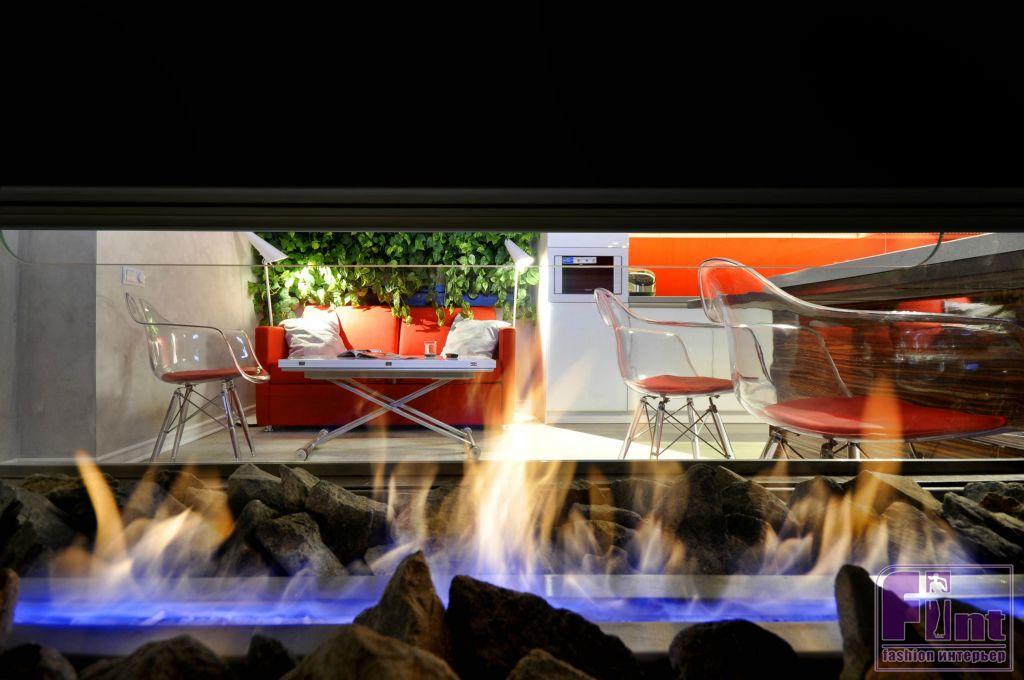 Чтобы подвесить камин пришлось рассчитывать большую металлическую конструкцию, которая была больше самого камина. В процессе реализации проекта специалисты вскрыли полы и спрятали вокруг очага его опору, которая держит биокамин всего на одной точке! В итоге получилось очень воздушно, хотя сама конструкция камина весит больше 150 кг. Вся конструкция была протестирована на нагрузку и провисание - всё получилось отлично!