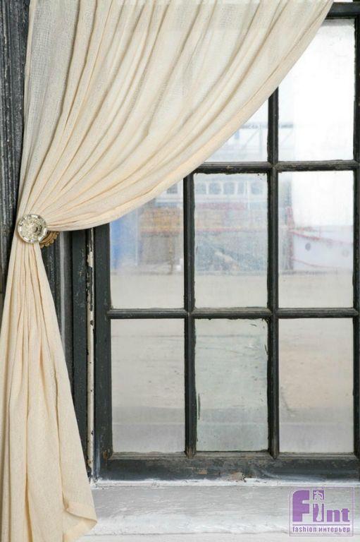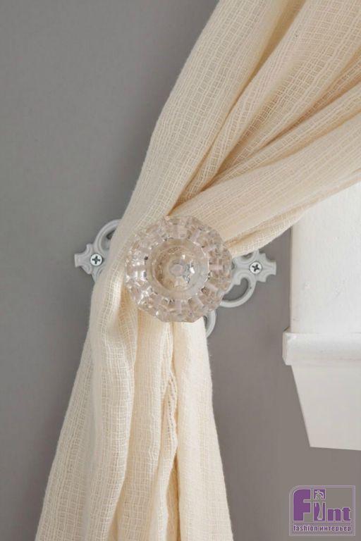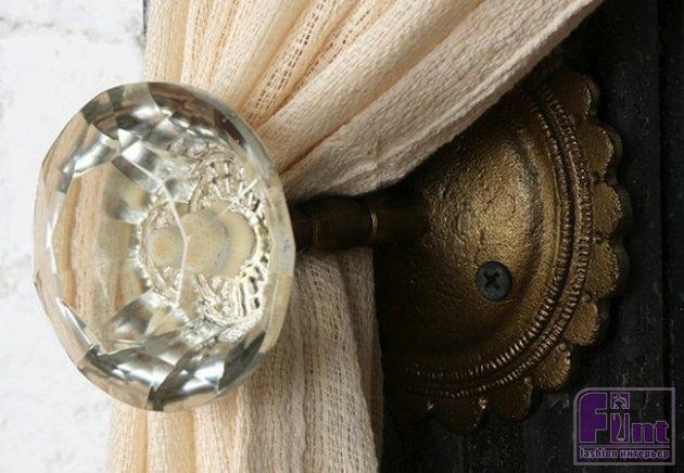 Вместо обычных прихватов для фиксации штор можно использовать симпатичные дверные ручки. Зеленоватый цвет стекла подчёркивает античный блеск латунной основы.