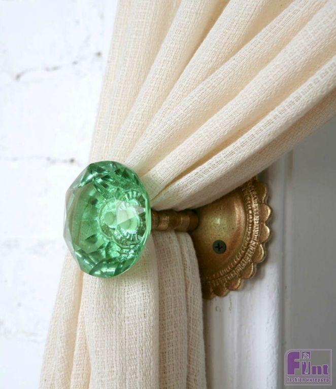 Вместо обычных прихватов для фиксации штор можно использовать симпатичные дверные ручки. Зеленоватый цвет стекла подчёркивает античный блеск латунной основы.