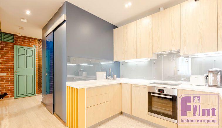 При выборе кухонного блока Виктория остановилась на мебели с фасадом из светлого дерева. Отсутствие ящиков и микроволновка, вынесенная из рабочей зоны в столовую, по словам дизайнера, красноречиво говорит о том, что хозяин квартиры пока холостяк. «Это не опасно и очень удобно. Разогрел - и сразу на стол», - комментирует Виктория. Разграничить две зоны дизайнер решила небольшой кирпичной стеной.