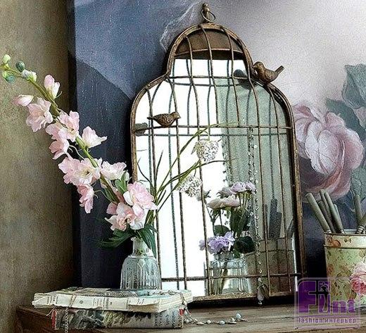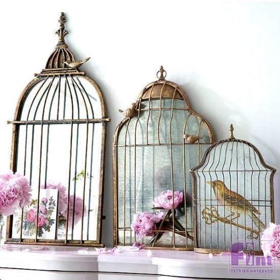 Отлично смотрятся специально состаренные прутья клетки на фоне старого зеркала. Сами прутья можно украсить любыми элементами: от фигурок птиц, до ракушек, перьев и цветов. Предлагаем Вам подборку из 21 фотографии птичьей клетки в винтажном интерьере.
