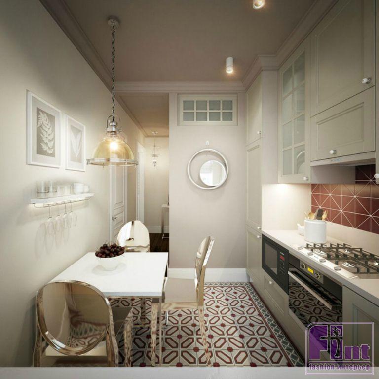 Стены квартиры в ходе реализации проекта подверглись существенным изменениям. Их очистили от штукатурки, а саму кирпичную кладку выкрасили. Для потолков Дмитрий выбрал серый цвет, что позволило визуально скорректировать вытянутые пропорции помещения, придав им объём. В прихожей и кухне дизайнерская цементная плитка позволила создать оригинальные акценты, привлекающие внимание.