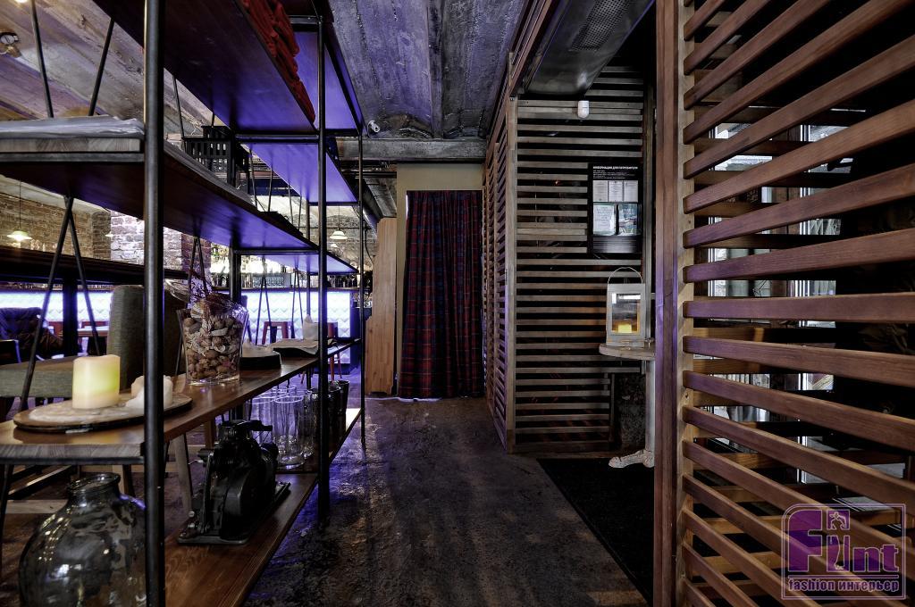 Барную стойку расположили у стены. Рядом – вход в санузлы. Стойку DJ разместили напротив входа. А сам вход оформили необычным гардеробом, выполненным в виде шкафов из тонких деревянных реек. Зал разделили небольшим подиумом с мягкой зоной и создали легко трансформируемое, мобильное пространство, так как владельцы заведения предполагали проведение в баре разноплановых мероприятий.