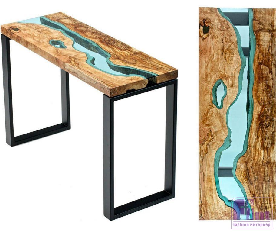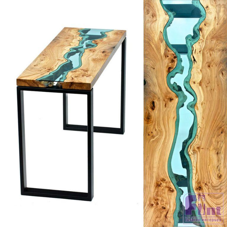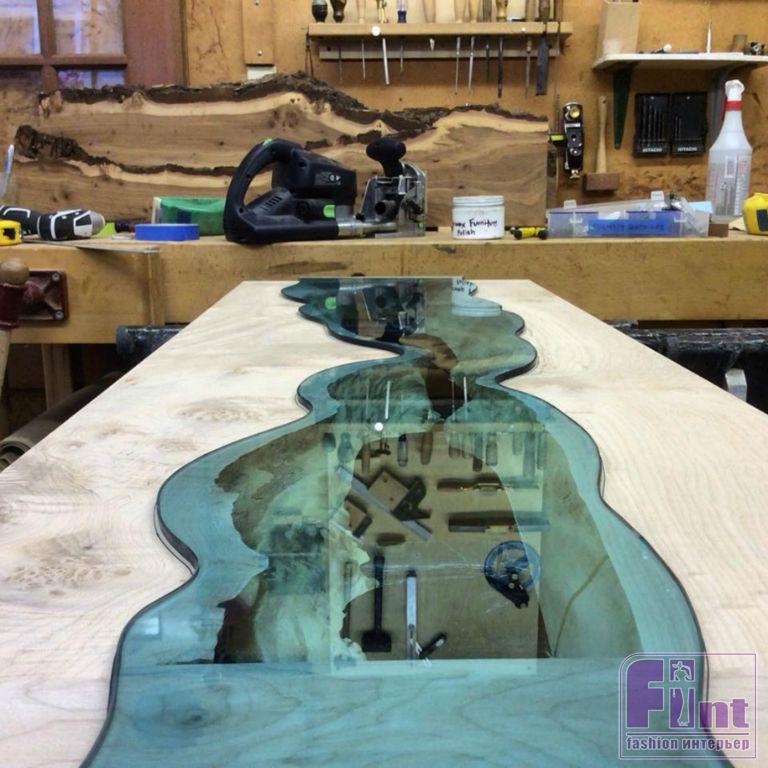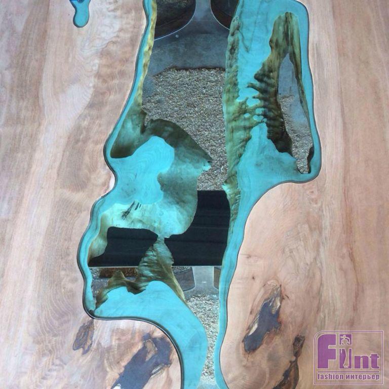 Как правило, каждый стол, выполненный художником, состоит из двух половинок дерева, между которых крепится толстое стекло, похожее на реку, текущую между двух берегов. Каждое такое изделие художника уникально и создаётся в единственном экземпляре.