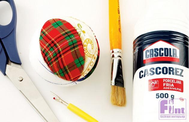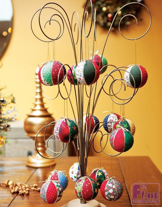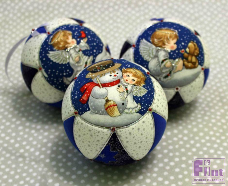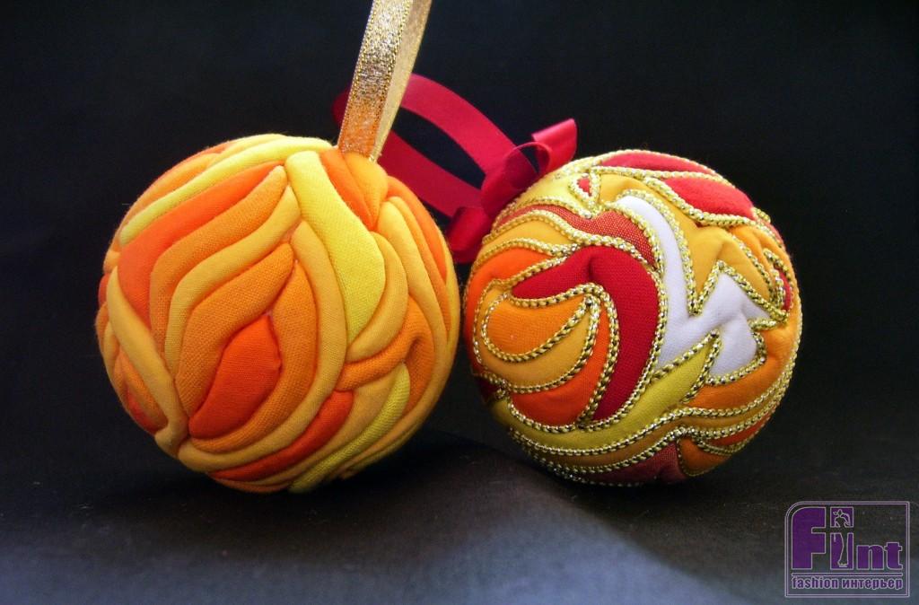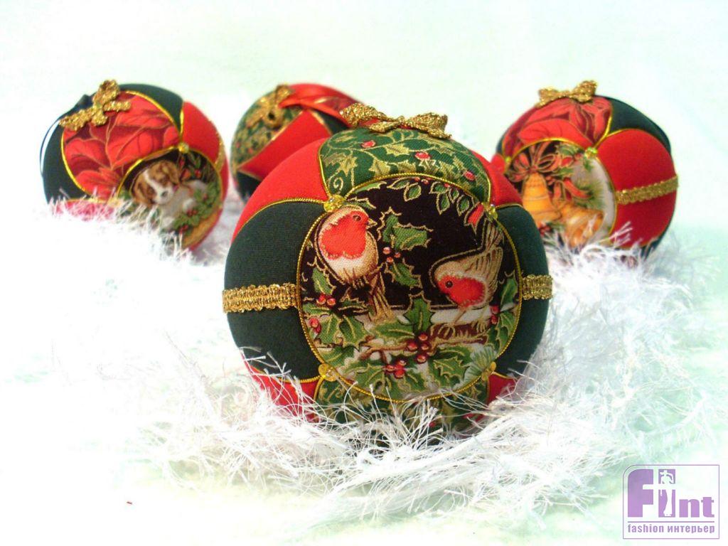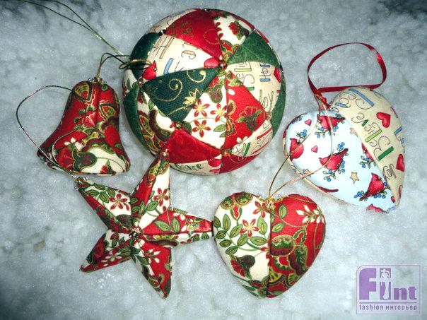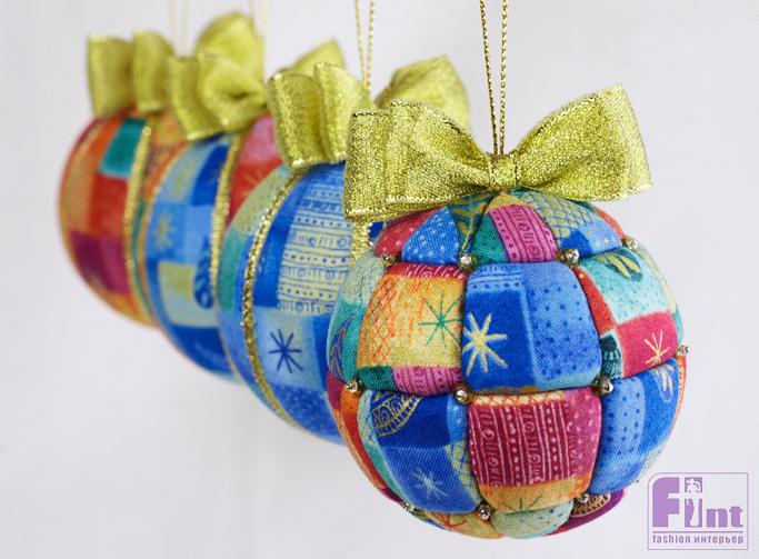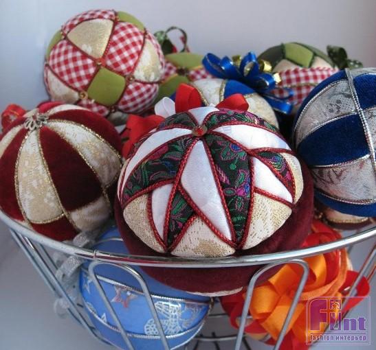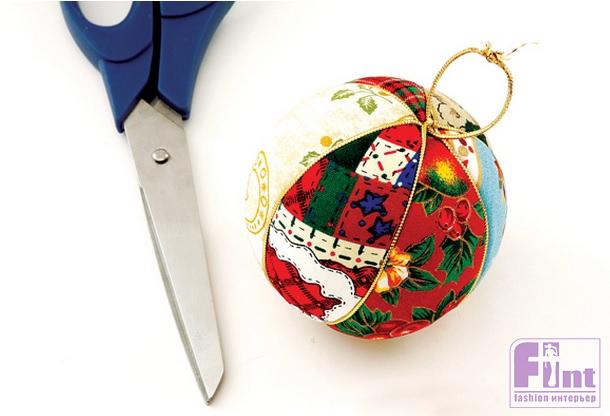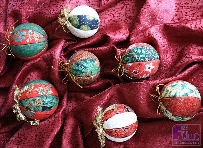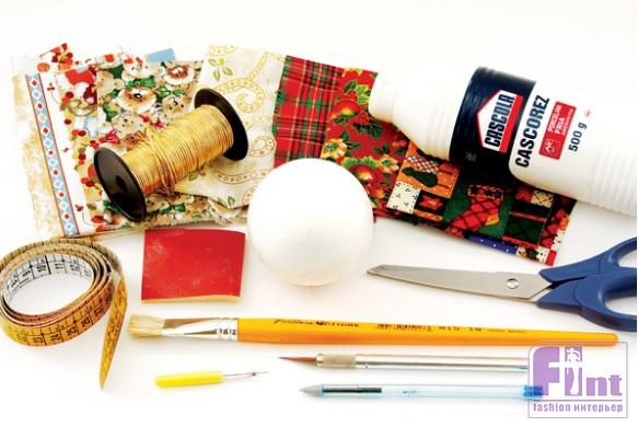 Для работы необходимы готовые шары из пенопласта, а также лоскутки хлопчатобумажной ткани, канцелярский нож, клей и ножницы. Яркими веселыми шарами можно украсить к празднику не только ёлочку, но и подходящие предметы интерьера (зеркало, камин, окно и т.п.).