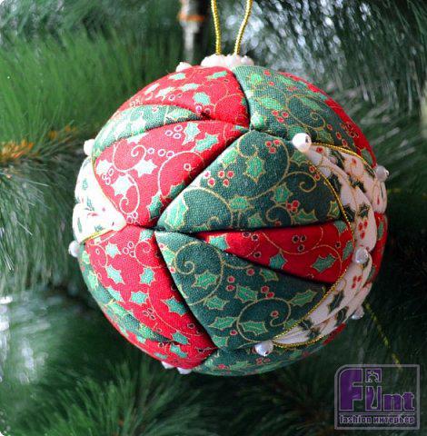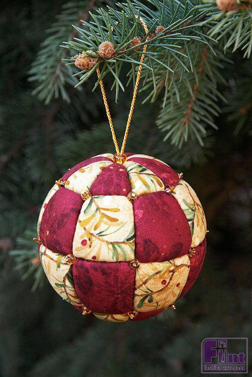 Лоскутки ткани нарезаются по размерам сегментов с припуском на загиб и вставляются в шарик. Чтобы наше ёлочное украшение выглядело идеально, можно дополнительно смазывать сегменты шарика клеем, чтобы ткань ложилась на пенопласт ровно.