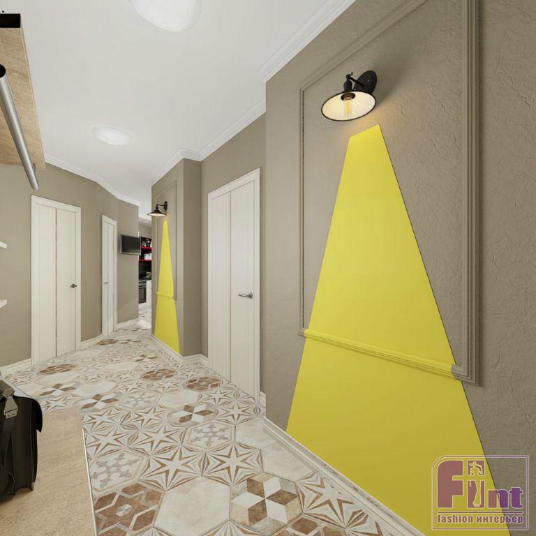Для начала Евгения изменила форму перегородки между коридором и гостиной, что помогло расширить коридор. Дверной проём симметрично украсили декоративными композициями из бра и настенными молдингами, на стенах появился оригинальный рисунок, имитирующий луч света от уличных фонарей.