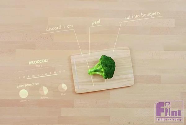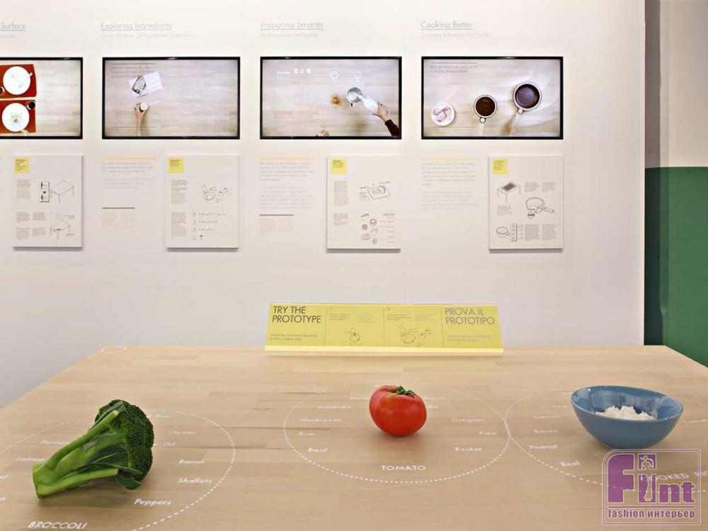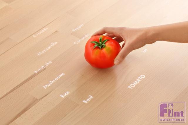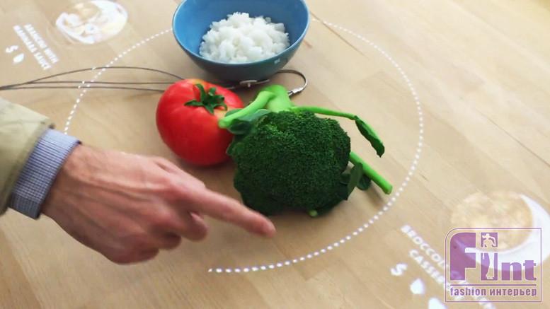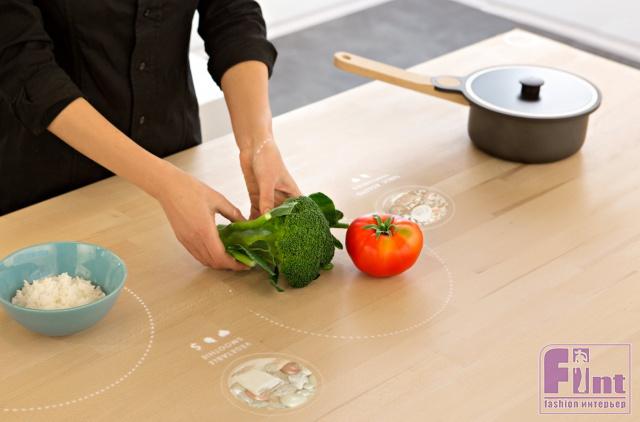 Над столом закрепляется специальный модуль с камерой и встроенным проектором. Поверхность стола тоже может скрывать дополнительные устройства, например индукционные панели для подогрева продуктов или зарядки смартфона, который участвует в процессе поиска рецептов.