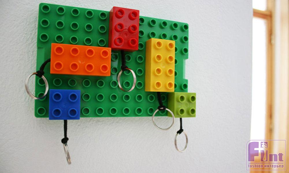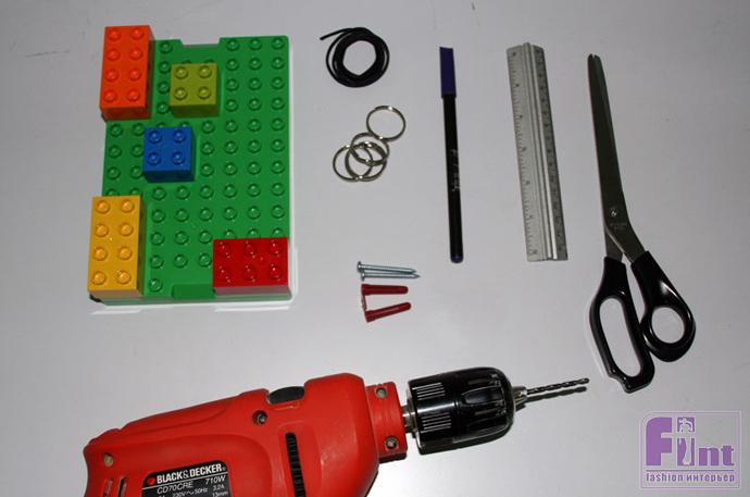 В результате получился очень интересный элемент интерьера, который с изяществом заменит традиционные крючки для ключей и избавит от необходимости держать на полке возле входа специальную чашу для ключей. Особенным можно также назвать тот факт, что для создания подобного шедевра инженерной мысли, скорее всего, у вас дома уже есть все нужное. Это обыкновенные кольца для связок ключей, немного толстой прочной нитки или синтетического шнура, пара шурупов, и инструменты. Да – еще нужен старый конструктор LEGO с платформой.