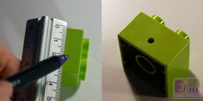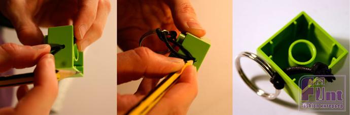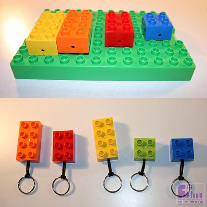 В качестве брелоков для ключей нужно будет использовать кубики LEGO. Для этого в боковой части кубика рассверливают отверстие, продевают в него шнурок с прикреплённым кольцом для ключей и на продетом внутрь кубика конце завязывают узелок.