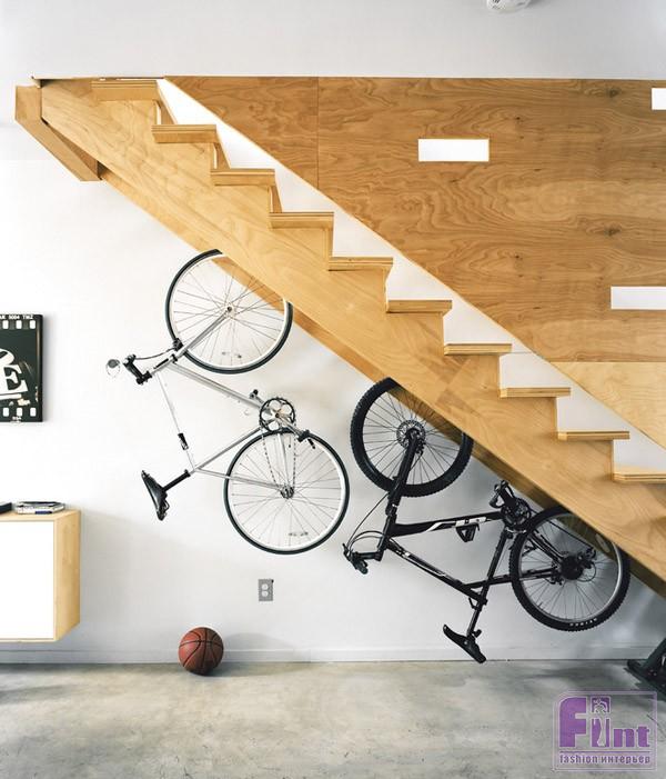 Конечно при принятии решения, как организовать пространство под лестницей, следует учитывать, где оно располагается. Если в коридоре, то вполне логично будет создать из него гардеробную, где будет храниться верхняя одежда, шляпы, перчатки, обувь и аксессуары. Можно организовать просто шкаф с открытыми полками или с дверями, в зависимости от эстетических предпочтений. Если такое пространство организовать в качестве множества ящичков, то можно получить прекрасную зону для хранения вещей. Причем не всегда под лестницей нужно создавать какие-то сложные конструкции для хранения. Иногда достаточно приделать специальные крепежи и создать место куда можно, например, подвешивать велосипеды. К тому же такое решение может стать весьма интересной изюминкой интерьера.