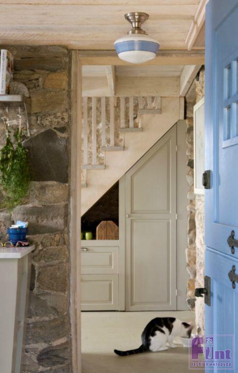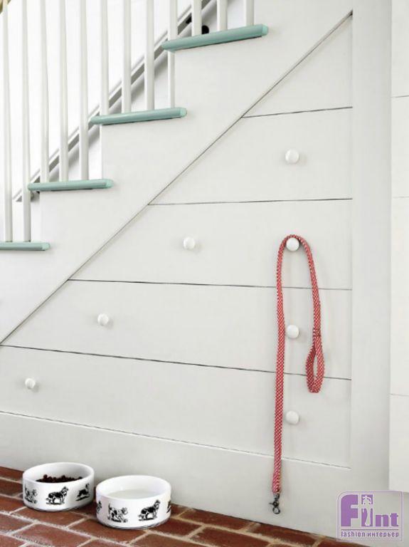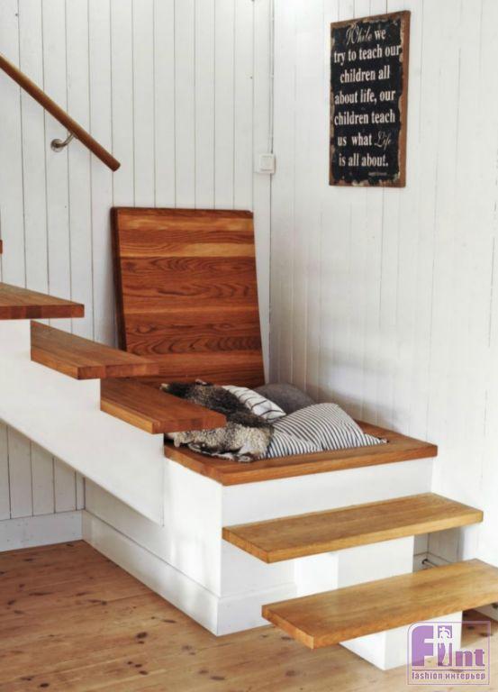 Под лестницей можно организовать компактную ванную комнату или прачечную. Весьма оригинальным будет создание из этого пространства уютного местечка для домашних животных. Ведь если в доме обитают животные, то можно для них обустроить отдельную комнатку под лестницей, в которую попасть они смогут через специальный вход. Это позволит разграничить кошачье и собачье пространство и привнести в дом приятный покой.