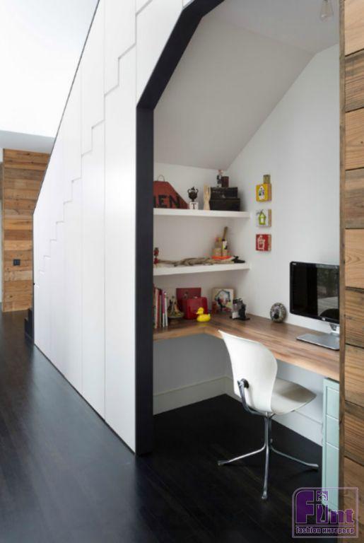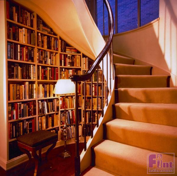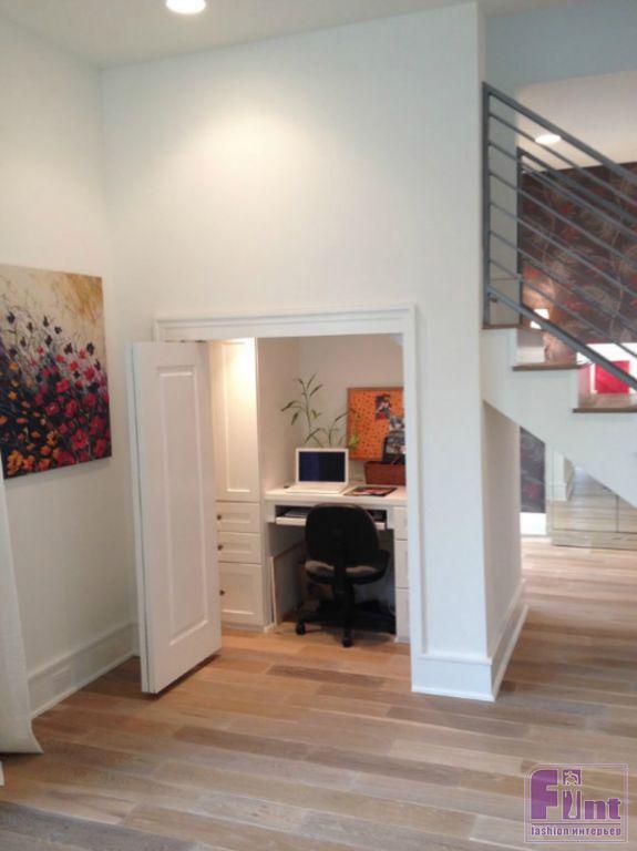 Использовать пространство под лестницей можно по-разному, но главное - с пользой. К примеру, весьма удобно и эффектно обустроить под лестницей книжные полки. Такое место можно превратить в очень комфортный домашний офис, который будет одновременно уютным, скрытым от посторонних глаз, и при этом очень удобным.