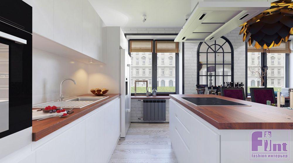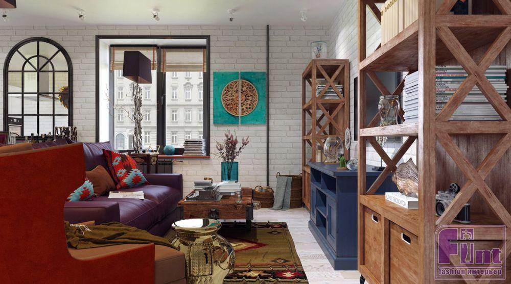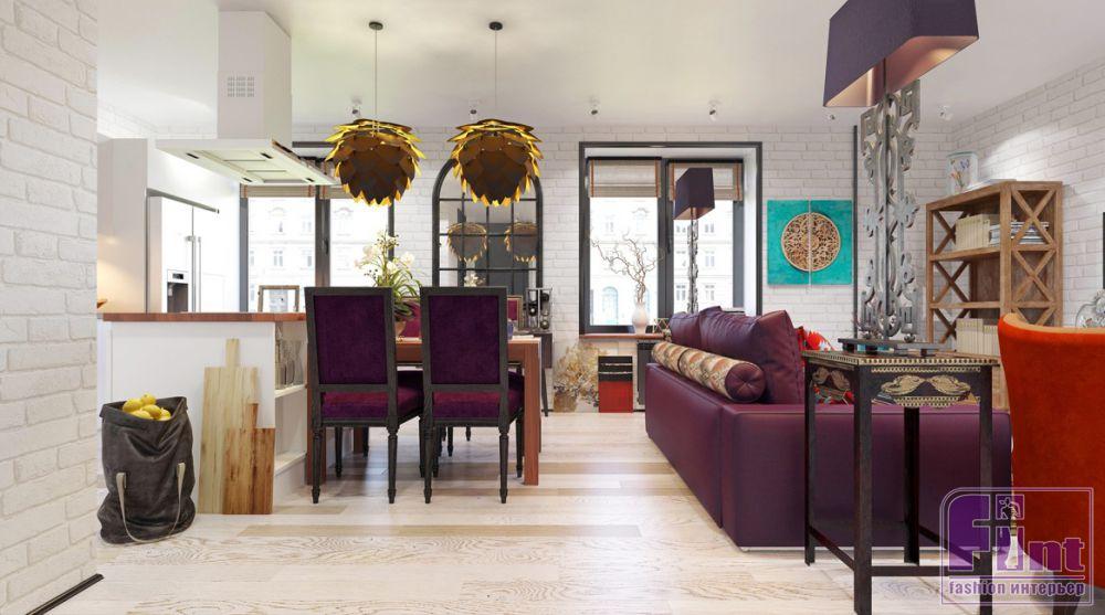 Для начала дизайнер выделила основные зоны. Дарья объединила кухню и гостиную, в результате кухня отошла на второй план, уступив первый пространству для отдыха, украшенному оригинальным декором. В качестве отделки автор проекта выбрала штукатурку сложных тонов, декоративный кирпич и дерево.