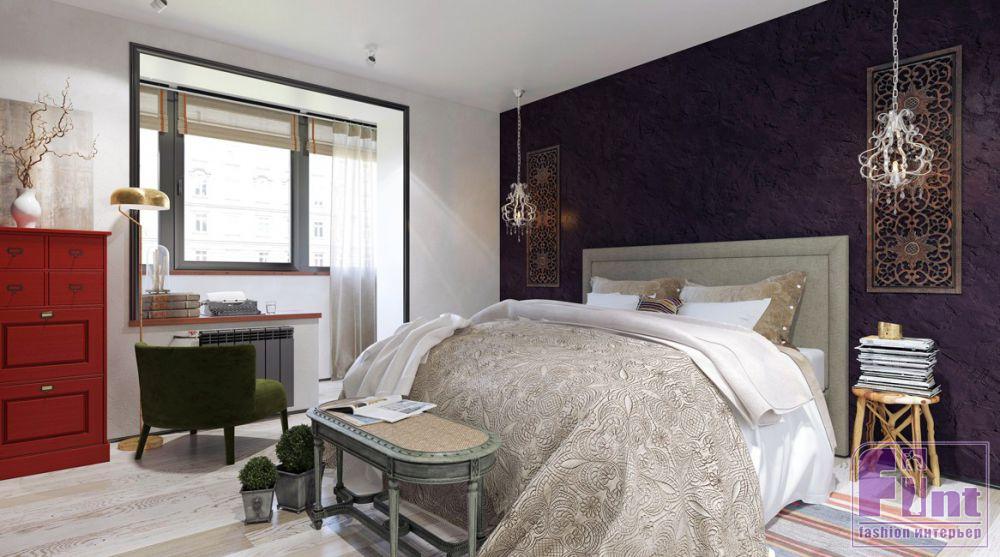 Кухню сделали максимально незаметной. Вдоль стены входной зоны организована система хранения. Приватные помещения - это две спальни, для заказчицы и её дочери. Спальня заказчицы с рабочим местом на присоединённой лоджии выглядит весьма необычно. Стена в изголовье кровати отделана декоративной штукатуркой.