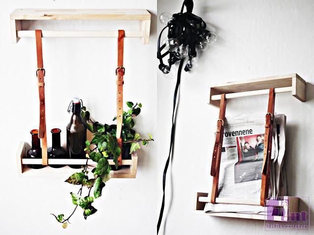 Из двух ремней и двух самых обычных подставок для специй можно соорудить очень необычную настенную полку! Достаточно оснастить одну полку настенным крепежом и застегнуть на ограничительном поручне два ремня. Неокрашенное чистое дерево прекрасно сочетается со старой благородной кожей. Для такой полки ремни лучше выбрать в натуральном коричневом оттенке, хотя для яркого интерьера можно использовать и цветные ремни.