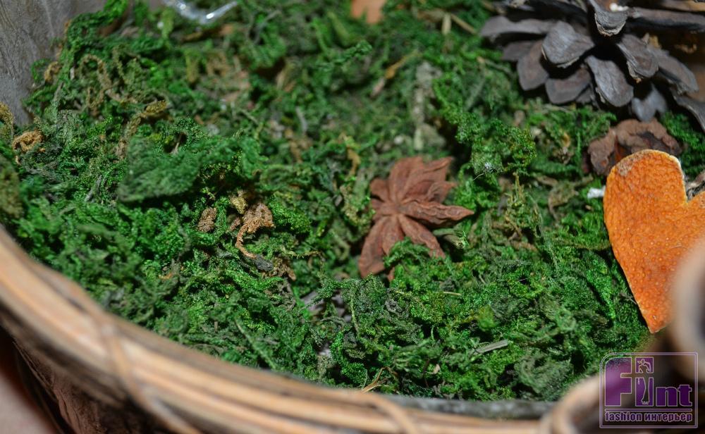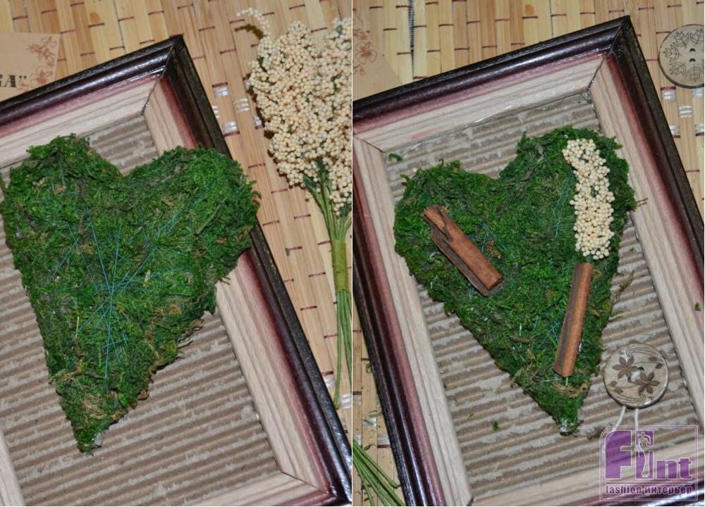 Для этой картины мы выбрали за основу натуральный мох. Приобрести его можно в магазинах для флористов или лавках рукоделия. Из мха мы будем делать вечно зелёное сердце.