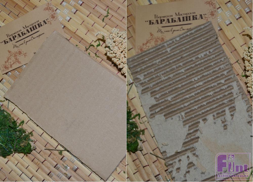 Затем делаем объёмный фон с помощью гофрированного картона, который используется в крупных упаковочных коробках. Если аккуратно оборвать верхний слой, то получится очень интересная фактура для нашей картины.