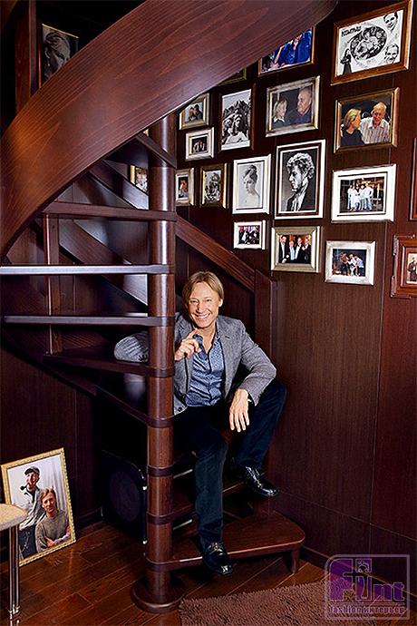 Как у любой творческой личности, в дома Дмитрия Харатьяна много памятных фотографий, профессиональных наград и просто милых безделушек. На стене возле винтовой лестницы можно обнаружить целую галерею из фотографий хозяина дома со своими близкими, знакомыми и друзьями – не менее известными в нашей стране людьми. Почётное место в доме занимают книги. Под них выделено несколько стильных открытых стеллажей.