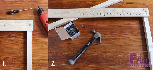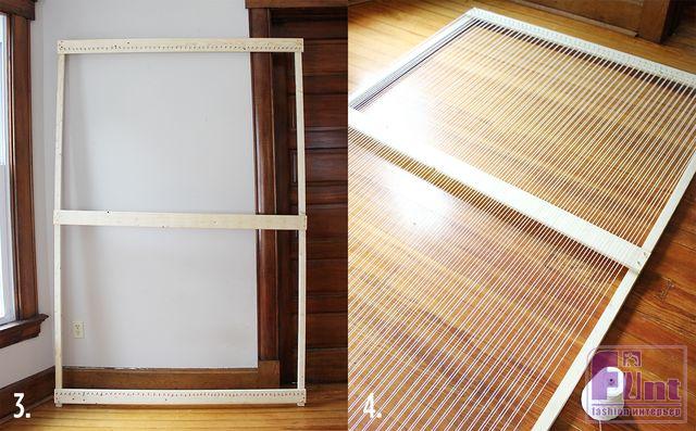 Шаг 1: Делаем раму для нашего «ткацкого станка». Саморезами скрепляем под прямым углом бруски с досками так, чтобы получился прямоугольник с «перемычкой» посередине. Предварительно сверлим отверстия под саморезы и вкручиваем саморезы очень аккуратно и медленно, чтобы не расколоть дерево. В каждом месте крепления фиксируем по два самореза, располагая их по диагонали к нашей раме.
