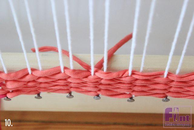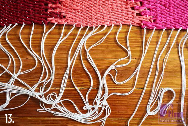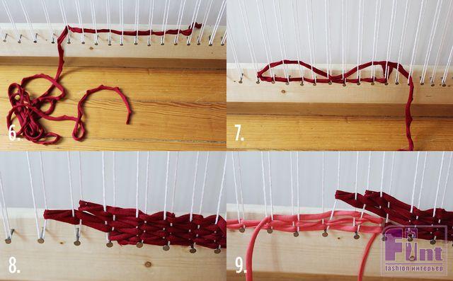 Шаг 8: Продолжите переплетать пряжу назад и вперед так, чтобы все ряды не были равномерными – так мы создаём зигзагообразный эффект на нашем будущем коврике.
