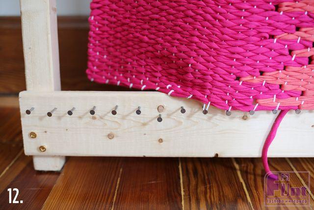 Шаг 4: Начинайте наматывать нитку на гвозди. Завяжите узел на первом гвозде с краю и идите зигзагообразно, опутывая гвоздь за гвоздём по порядку через всю раму. На последнем гвозде надёжно закрепите нить. Старайтесь сделать не очень сильную и не очень слабую натяжку нитей. Сильная затяжка деформирует будущий коврик, слабая не позволит сделать плотный коврик.